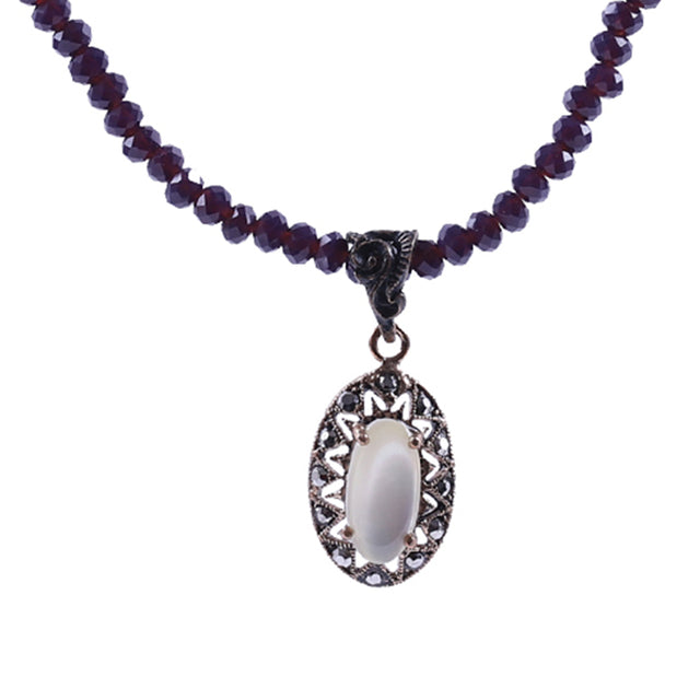 Collier Leyna en bronze perlé violet avec médaillon ovale en grande pierre blanche.