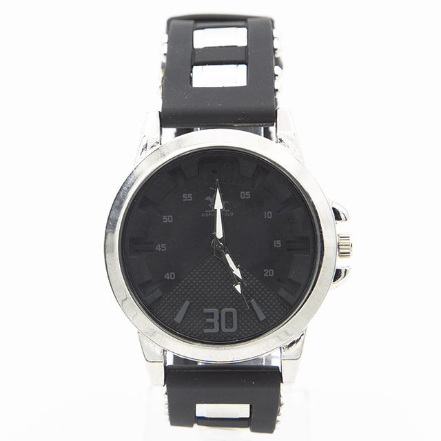Montre POLO P0002 pour homme noir. Bracelet en polystyrère noir. Cadran circulaire argenté, intérieure grisâtre à écrits grisâtre aiguille blanc. Marque Polo.