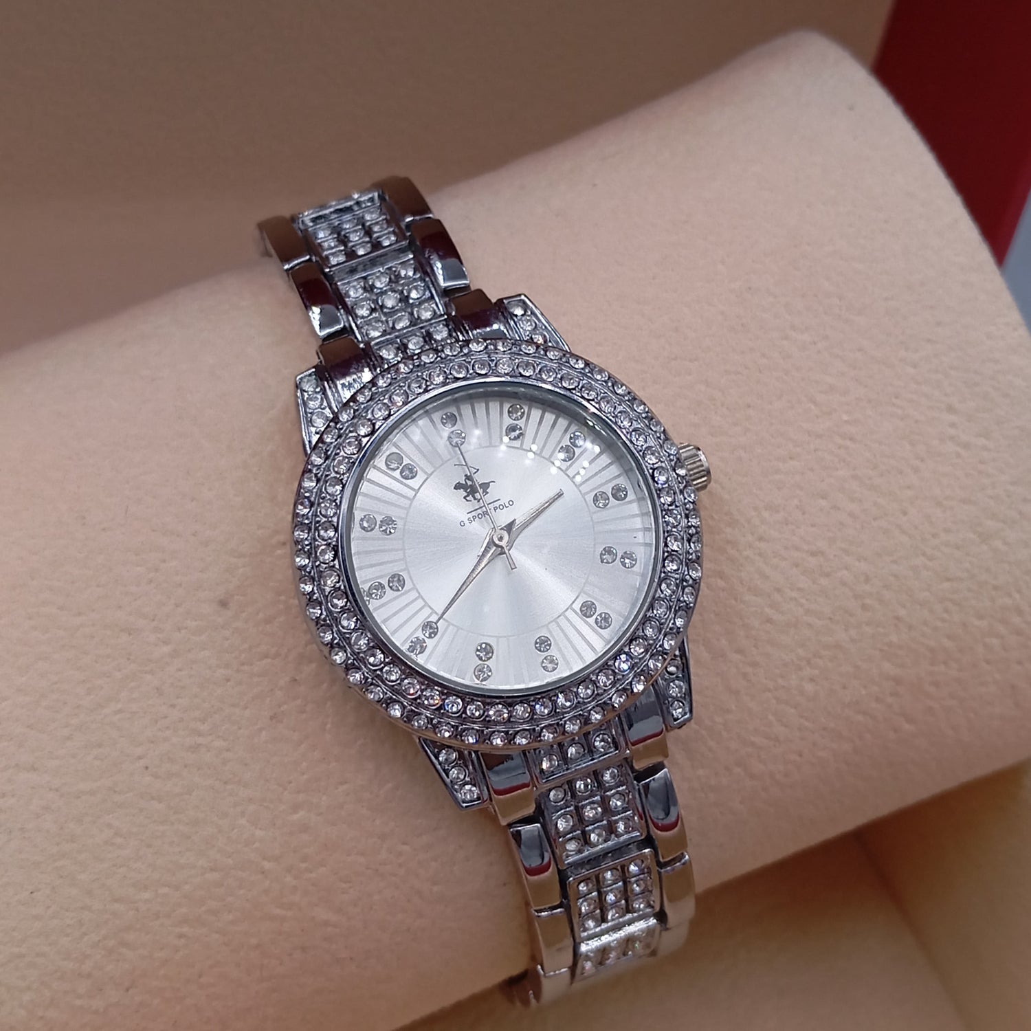 Montre POLO P0050 argenté pour femme. Bracelet en acier argenté. Cadran circulaire argenté, intérieur argenté. Montre sertie de strass. Marque Polo.