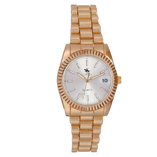 Montre POLO P0054 argenté doré pour femme. Bracelet serti en acier argenté doré. Cadran circulaire doré serti, intérieur blanc argenté. Marque Polo.