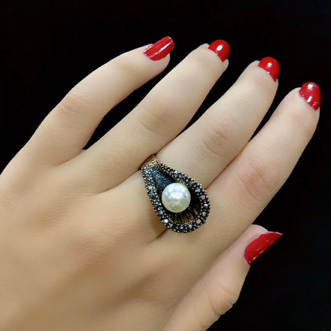 Bague Abélia en bronze ajustable. Design spécial, avec une perle incrustée sertie de strass.