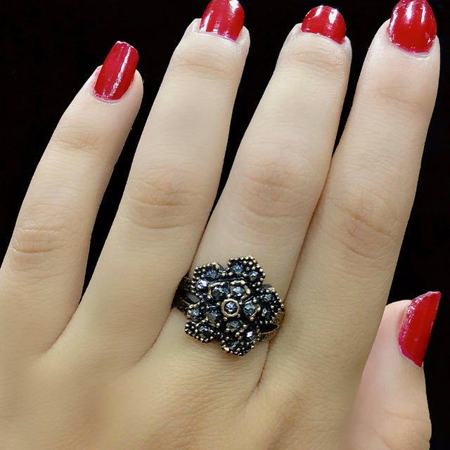 Bague Parma en bronze ajustable. Top en forme de feuille d'érable, sertie de strass.